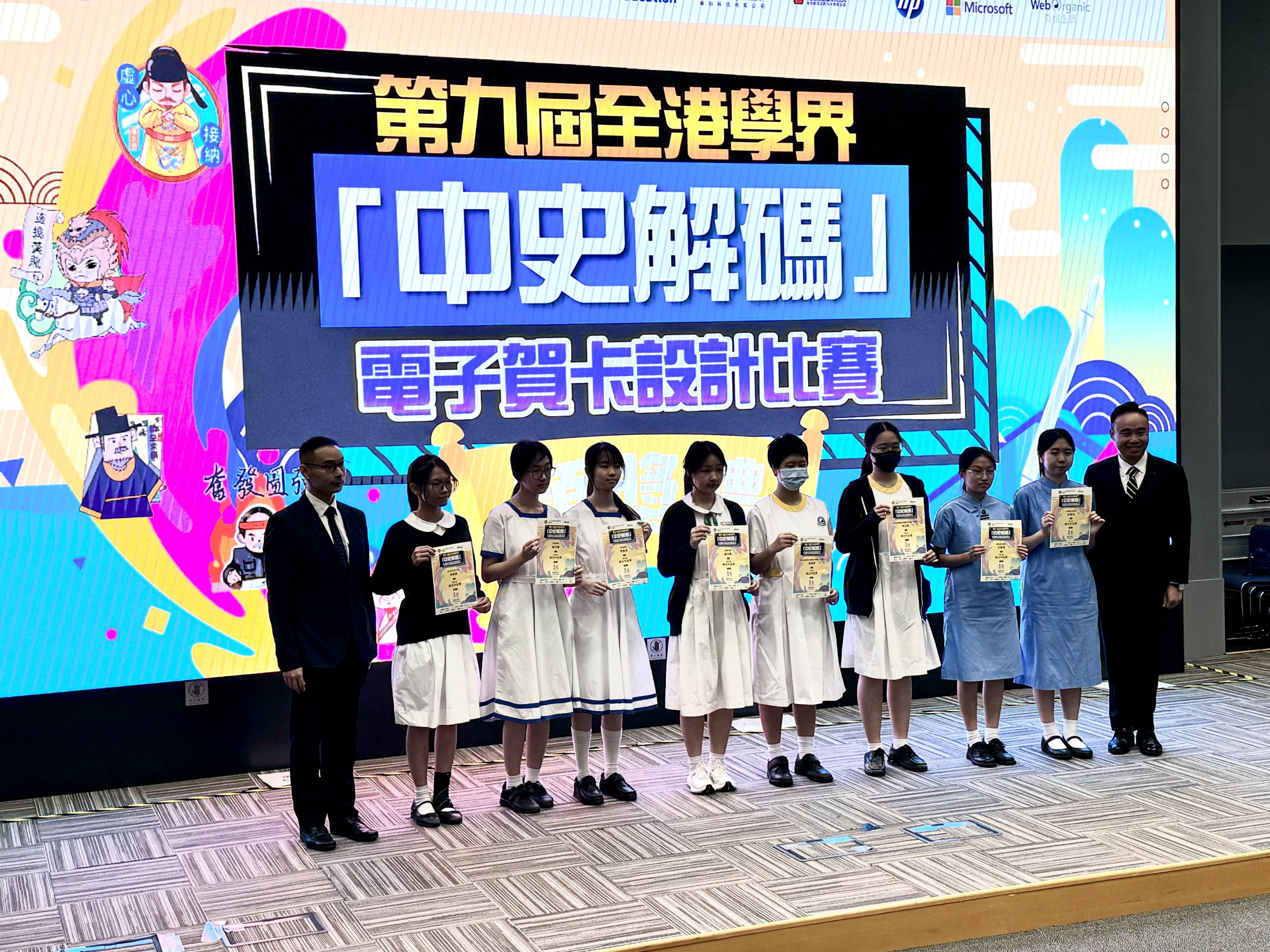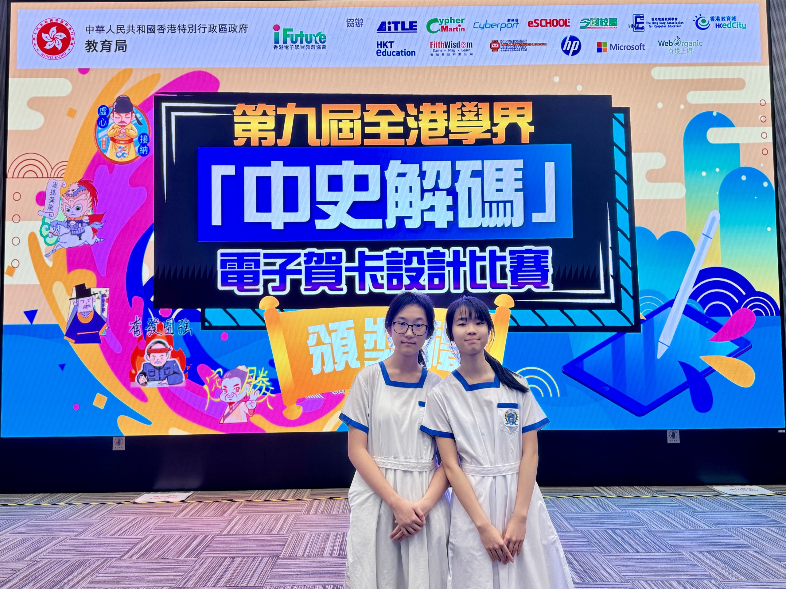 5A李鎧呈、5B趙芷晴參加第九屆全港學界「中史解碼」電子賀卡設計比賽,比賽要求學生選取一個節日,配以中國歷史人物或故事及一項價值觀和態度中,設計一張電子賀卡,並需要闡述設計概念。兩位同學最終在一種參賽者中獲得「傑出作品獎」。