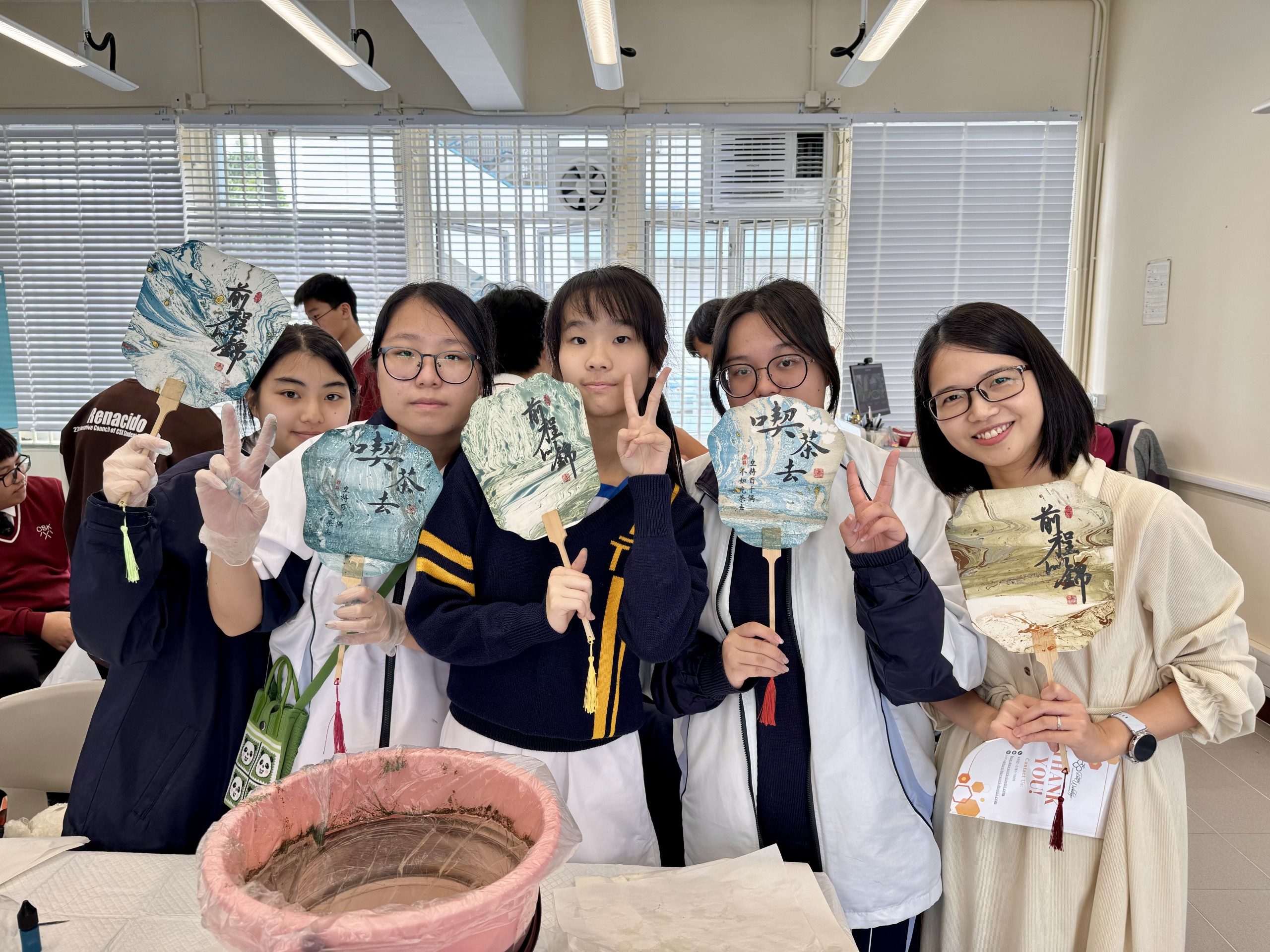 2024年11月23日,中五級八位修讀中史的學生在「建國歷史實境解謎比賽」中擊敗皇仁書院、喇沙書院、拔萃書院等一眾學校,勇奪全港冠軍!在比賽之餘,同學也體驗了中國非物質文化遺產--漂漆扇,加深對中華文化的認識。