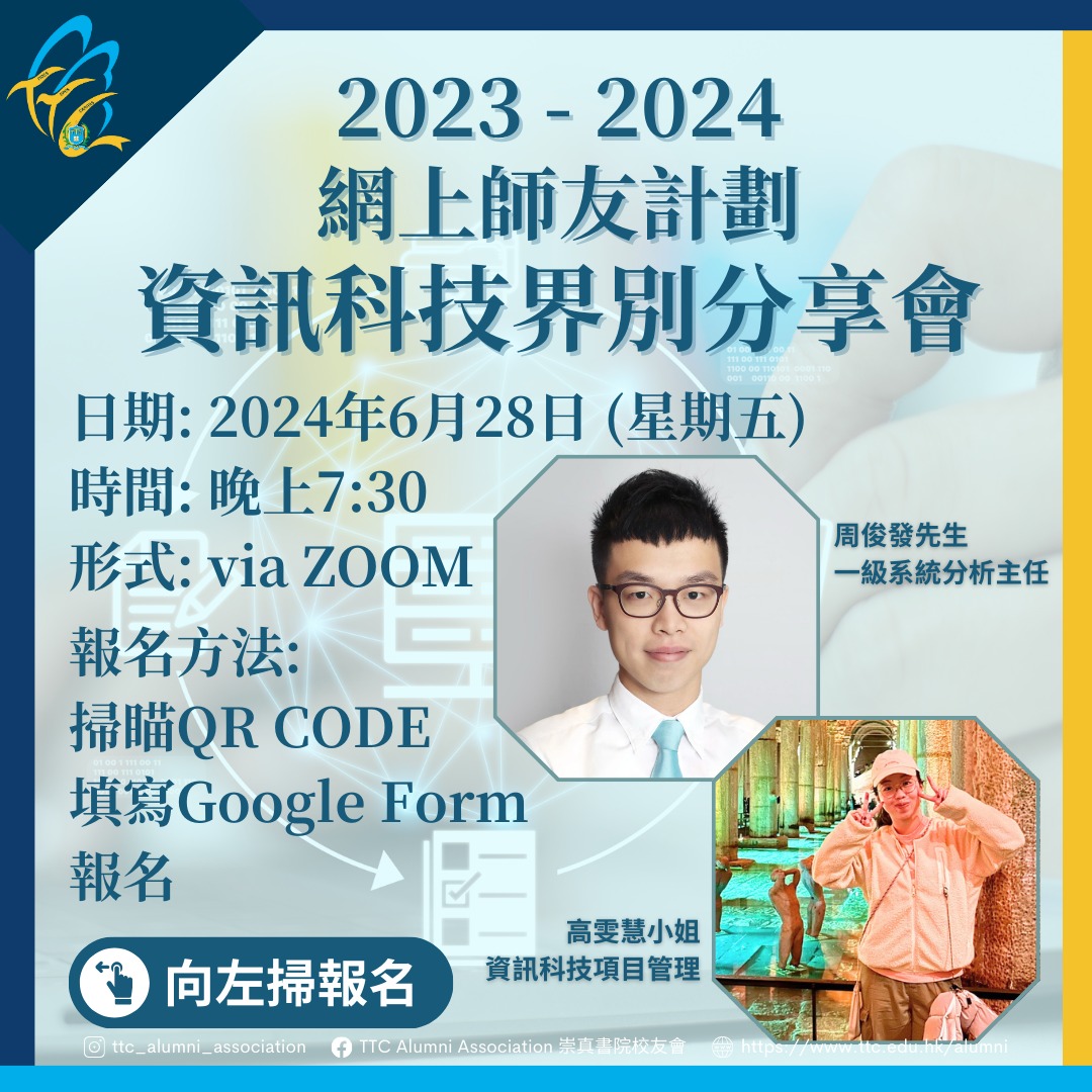 For More Information, Please Email or Facebook ✨ Ms. Ma Mei Lan ✨ Mr. Liu Man Wai ✨ Ms. Lau Chun Yuk Email:ttcalumni@ttc.edu.hk Facebook: TTC Alumni Association 崇真書院校友會 Instagram: ttc_alumni_association |